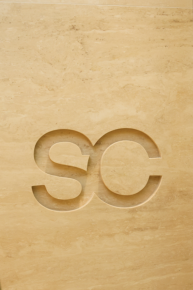 Um dos gestos mais simbólicos do projeto está na escolha do mármore travertino, selecionado pessoalmente por Sarah na marmoraria. A opção pelos tons mais claros possíveis dessa pedra buscou reforçar a estética Soft Nude, conectando espaço, produto e identidade visual.