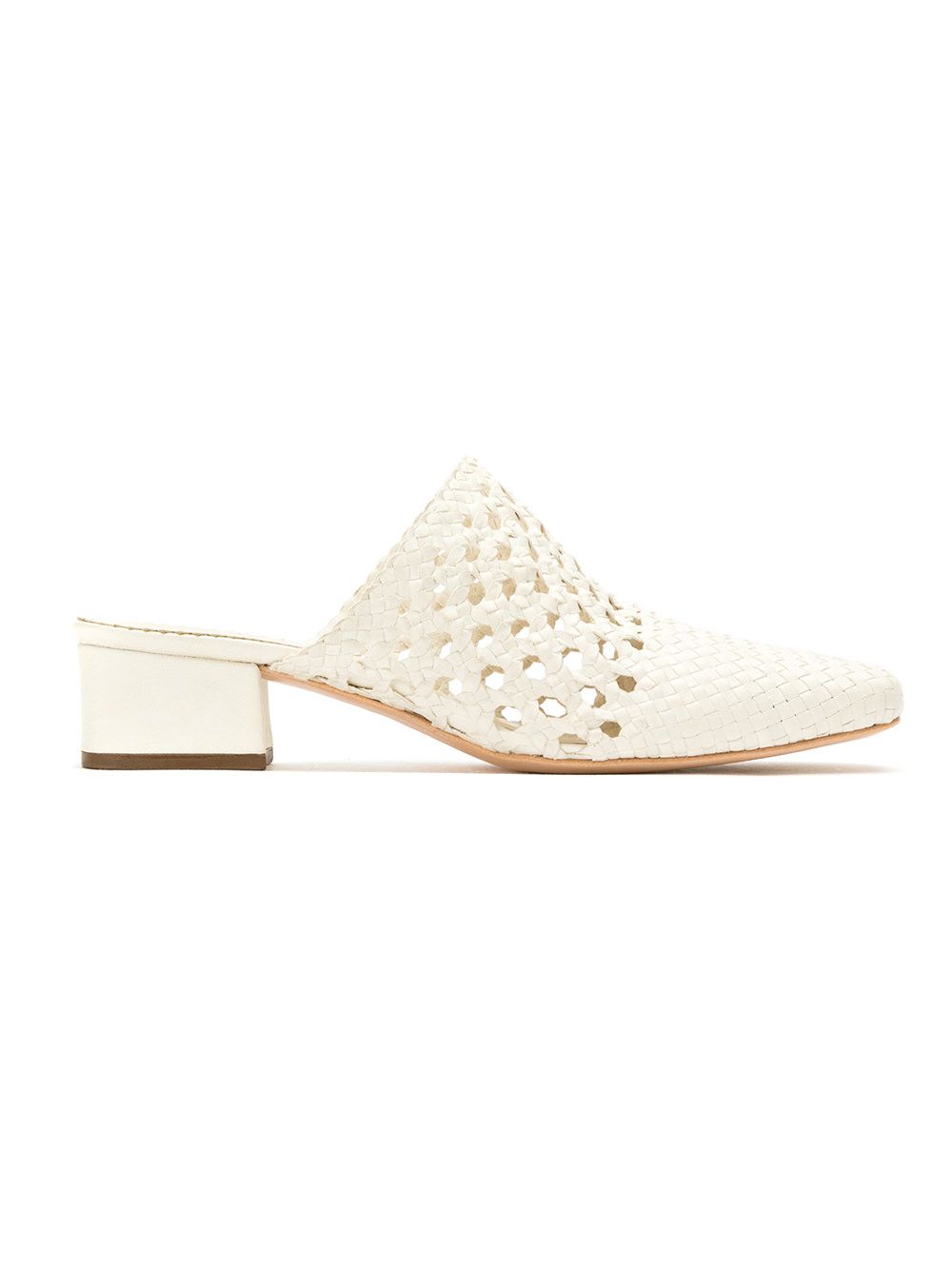 Mule de couro tressê off white, Sarah Chofakian. Com bico fino, design tressê e salto baixo.