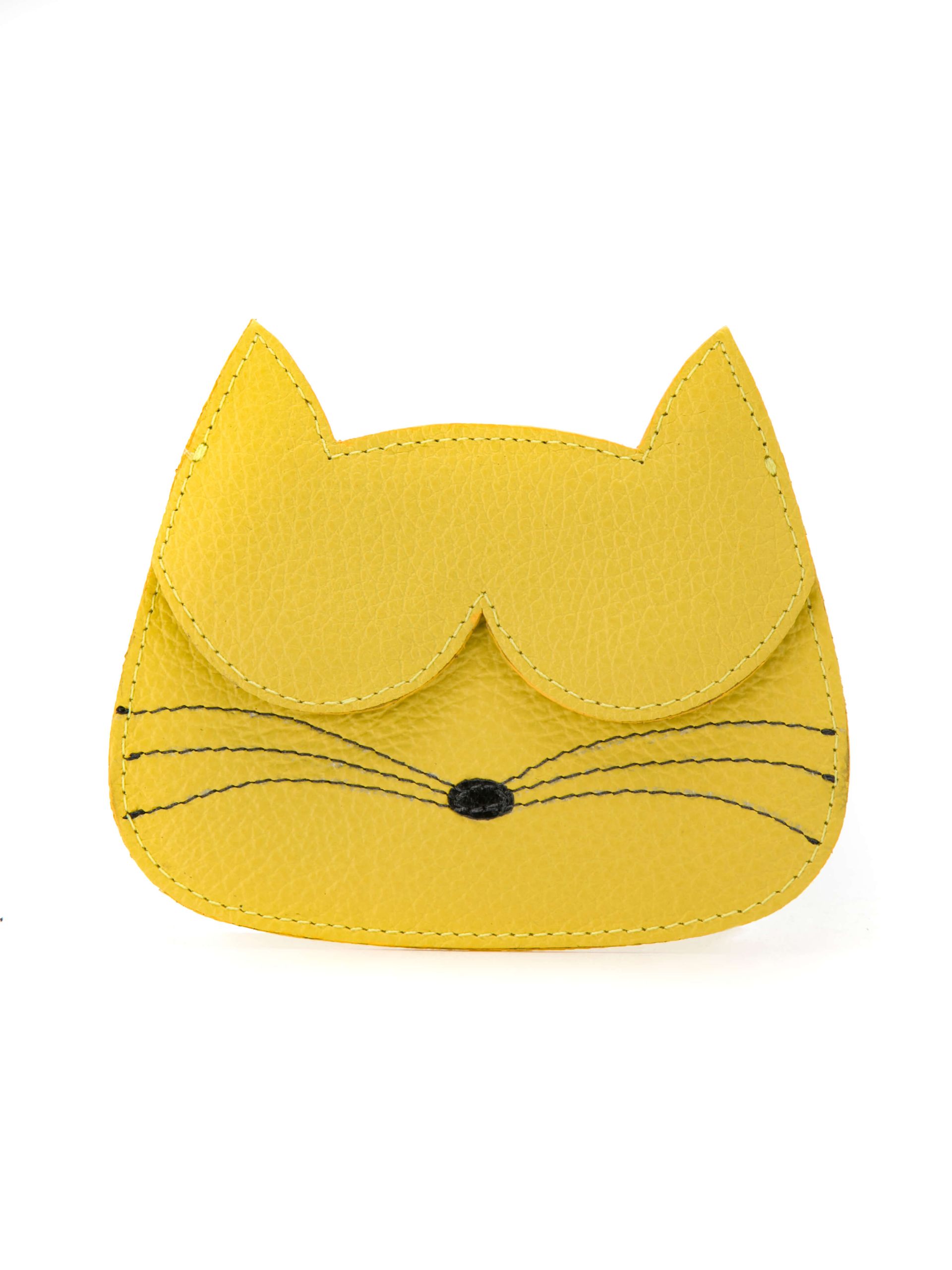 Carteira de couro amarela, Sarah Chofakian. Com formato de gatinho e aba com botão de pressão.