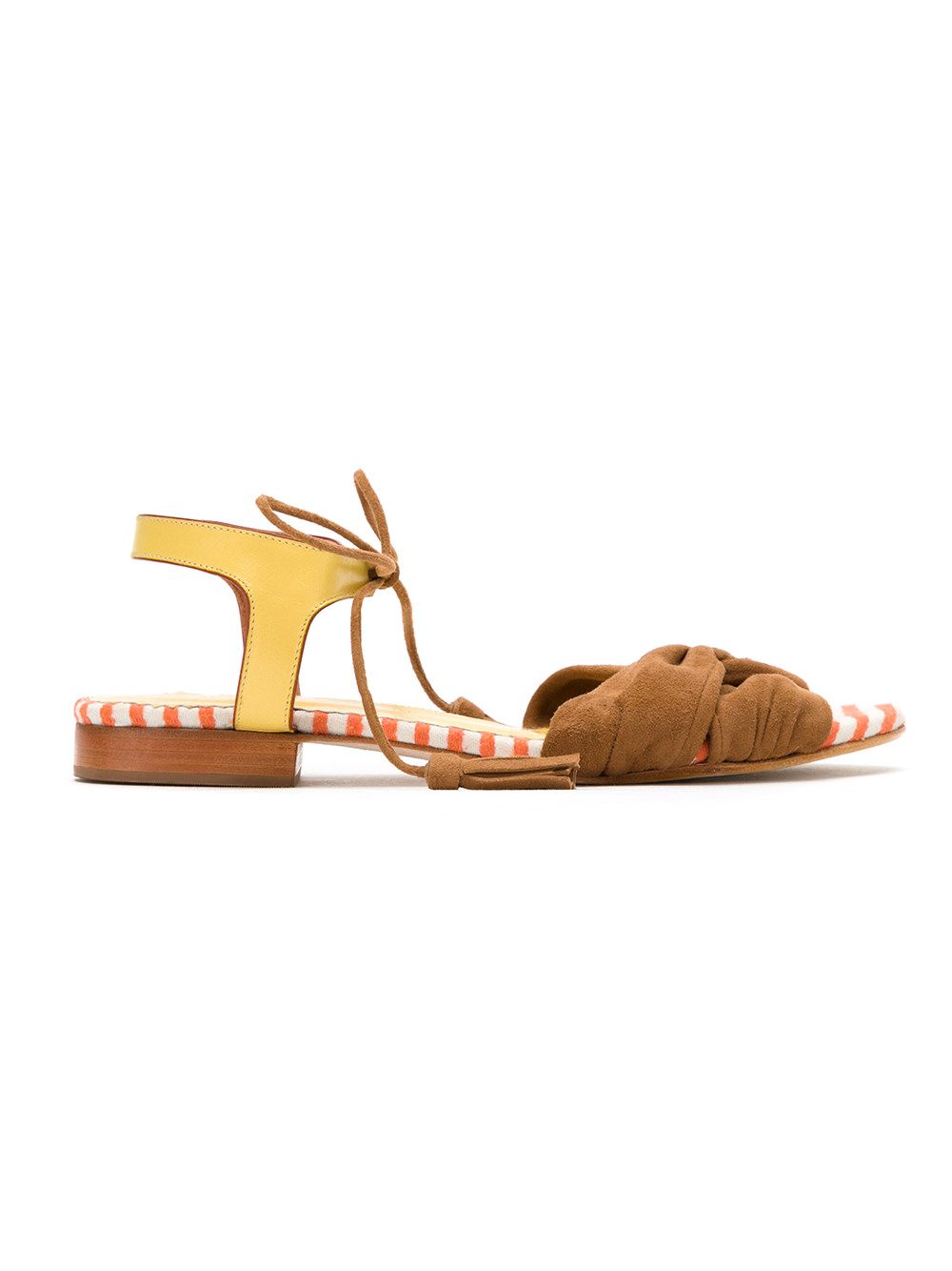 Sandália rasteira de couro amarela, Sarah Chofakian. Com nó frontal e amarração no tornozelo.