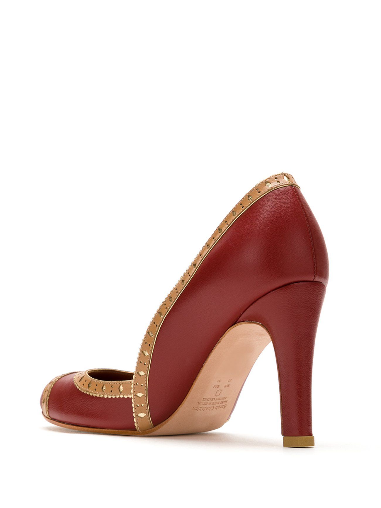 Scarpin Trust de couro vermelho. Com bico arredondado, detalhes em recortes contrastantes e salto alto de 7,5cm.