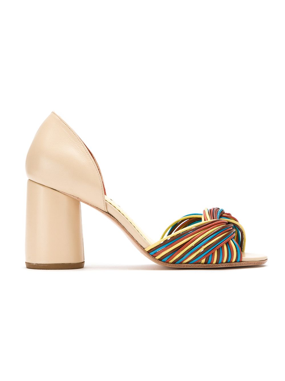 Sapato de couro rosê e multicolor, Sarah Chofakian. Com nó frontal, aberturas laterias, calcanhar fechado e salto alto.